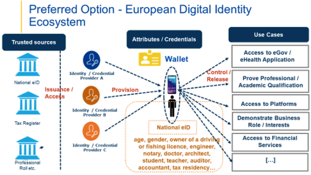 Het wordt verplicht voor lidstaten om een eID wallet te notificeren. Daarnaast bood eID voorheen alleen de mogelijkheid om in te loggen bij een overheidsdienst in een ander land. De identity wallets maken het mogelijk om meer attributen uit te wisselen, ook bij private dienstverleners in bepaalde sectoren. De onderliggende visie is dat de persoon, data vanuit de trusted sources, via de wallet kan delen om in andere lidstaten diensten te gebruik. Dit ondersteund allerlei use cases. Bijvoorbeeld het uitwisselen van diploma gegevens: een student wil een opleiding in een ander land afmaken en haar ECs of microcredentials meenemen. Het zwaartepunt verschuift hiermee van identificeren naar het delen van attributen.